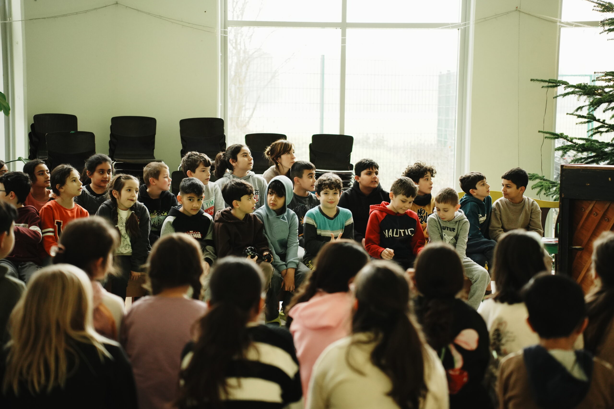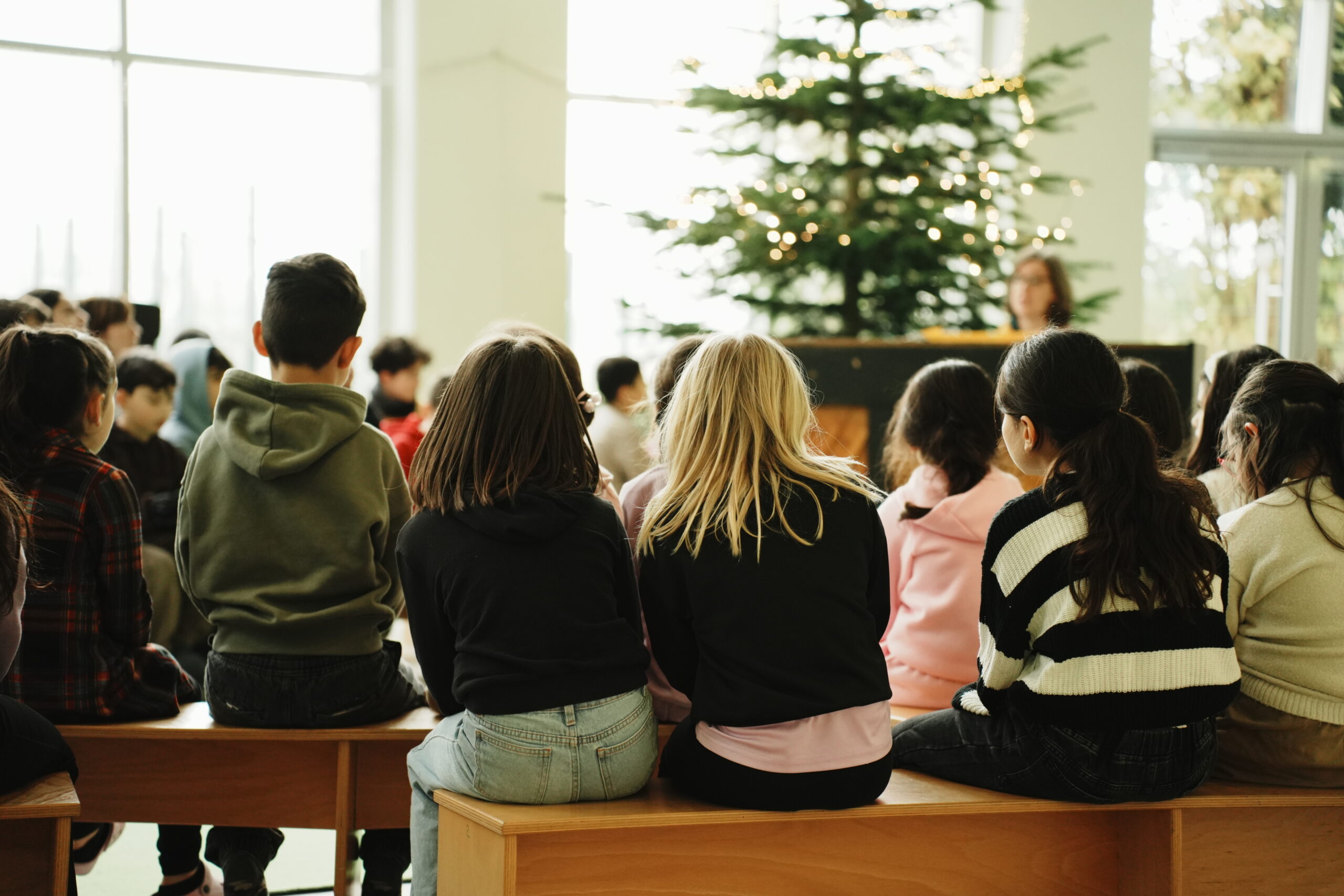 An zwei Tagen in der Woche treffen sich drei bis vier Klassen im Forum zum gemeinsamen Singen. Kinder, Lehrerinnen und Lehrer lernen Lieder zu den Jahreszeiten, üben unser Schullied und singen mit Bewegungen und Tanz. Die Lieder werden mit dem Klavier oder der Gitarre begleitet und regelmäßig kommt ein Mitglied des Nachbarschaftschores, um an der Trommel zu spielen. So kommen alle in Schwung und mit der Unterstützung von Bewegungen und kleinen Tänzen lernen Erwachsene und Kinder Lieder in verschiedenen Sprachen. Zur Unterstützung gibt es oft ein stimmungsvolles Bild und den Liedtext über den Beamer auf der Leinwand. Am Ende der Stunde gehen die Kinder mit den Lehrerinnen und Lehrern gut gelaunt wieder zurück in ihre Klassen und singen oder summen dabei häufig noch ein Lied, das sie in den Tag begleitet.